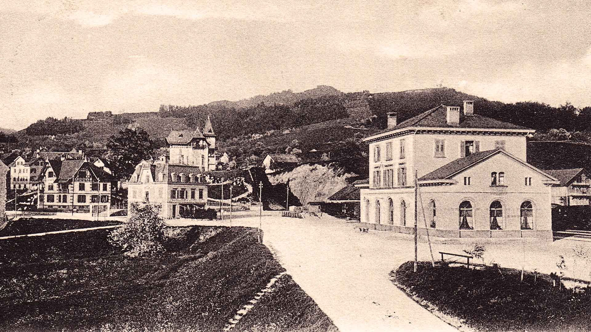Der (nach langem Streit endlich geplante) Bahnhof lag eigentlich unvorteilhaft weit ausserhalb des Dorfes. Drei Varianten für die Anbindung standen 1876 zur Diskussion. Eine Strasse vom Dorfzentrum zum Bahnhof schien die vernünftigste Lösung.