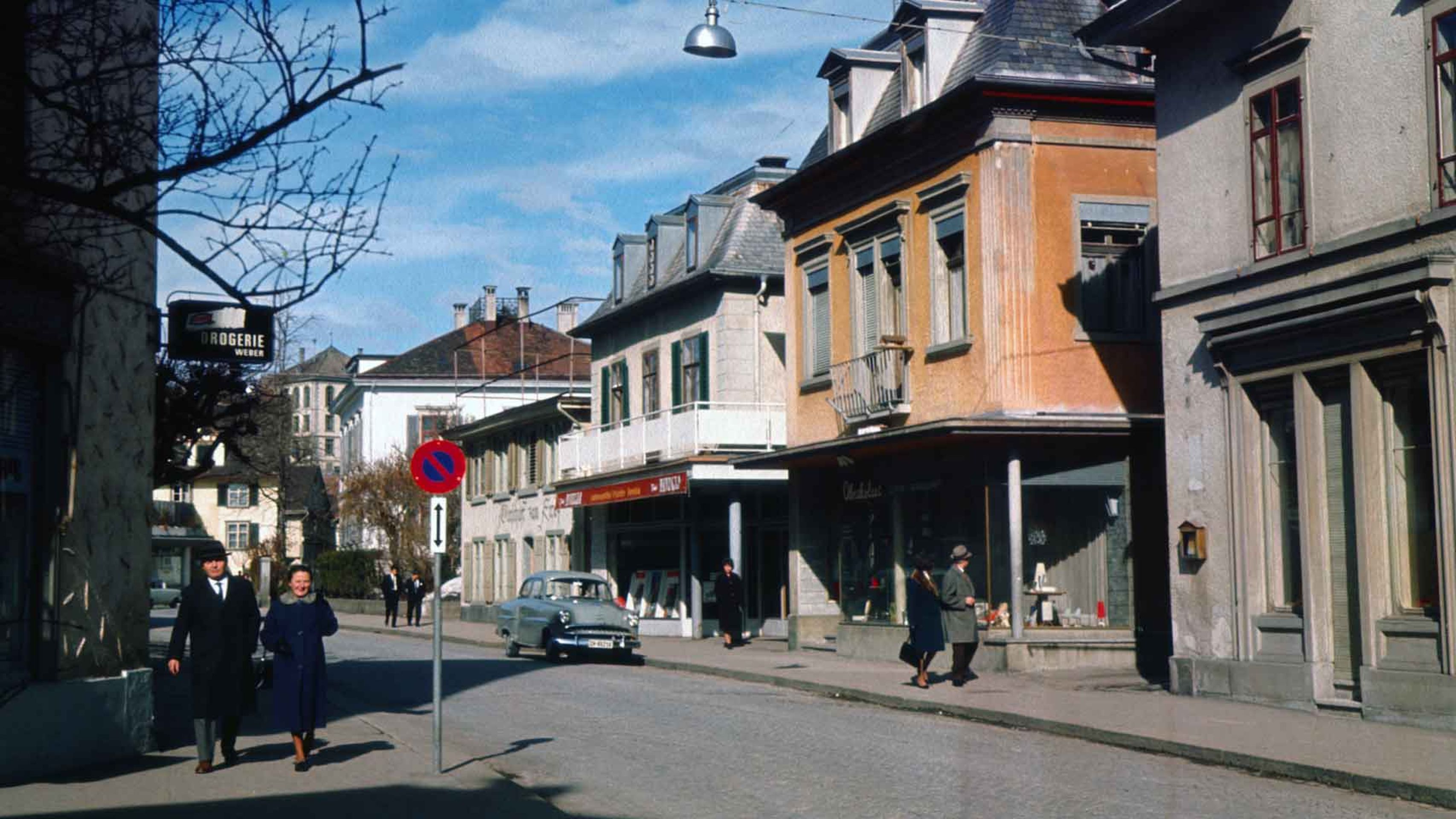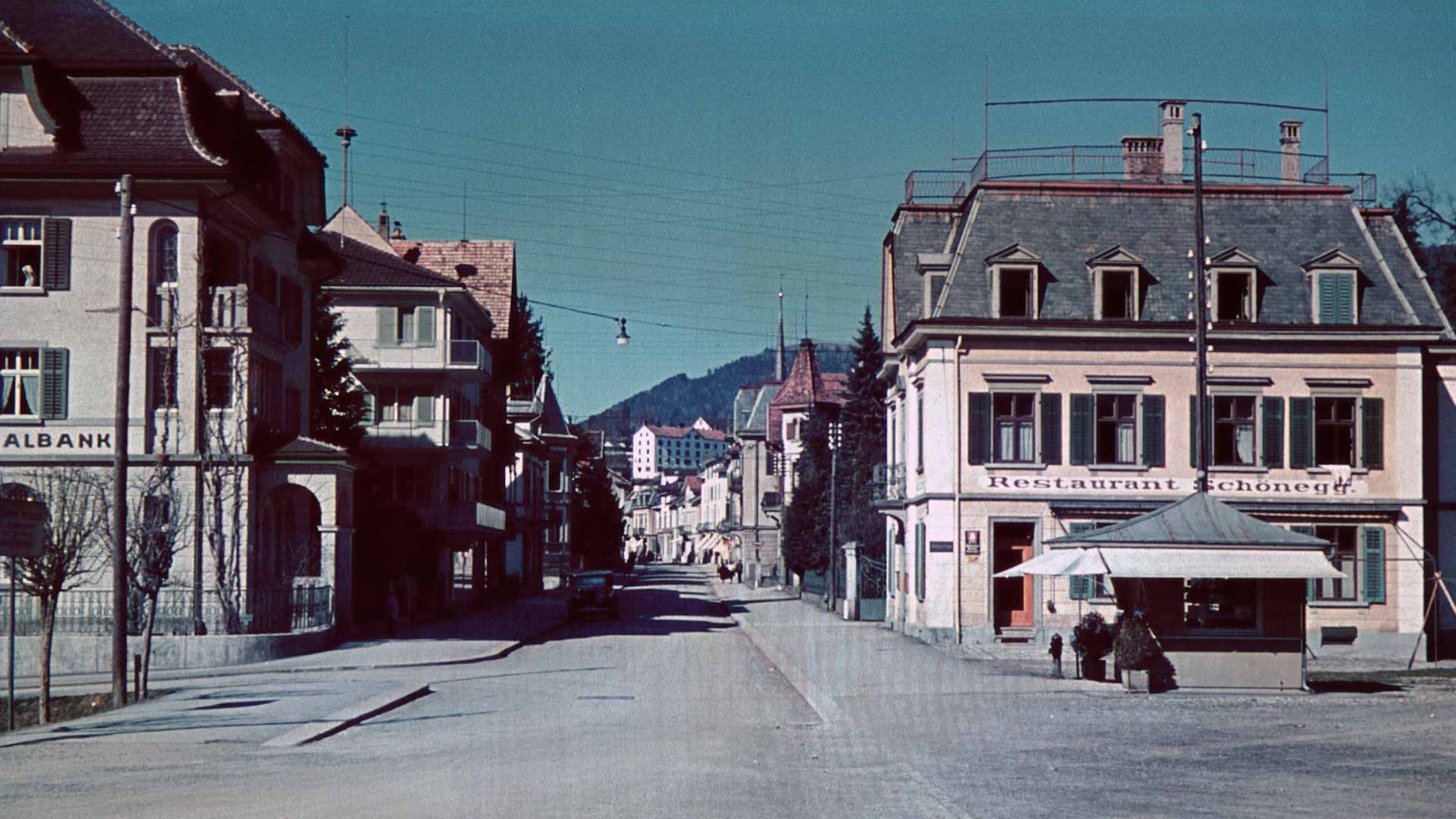 Der Verkehr hielt sich in Grenzen. Man konnte noch seelenruhig auf der Strasse bummeln. Der breite Aufgang zur Kirche zeigt: Die Szene wurde vor der Verbreiterung der Sanatoriumstrasse aufgenommen, in deren Folge man eine neue Lösung für das Westportal brauchte.