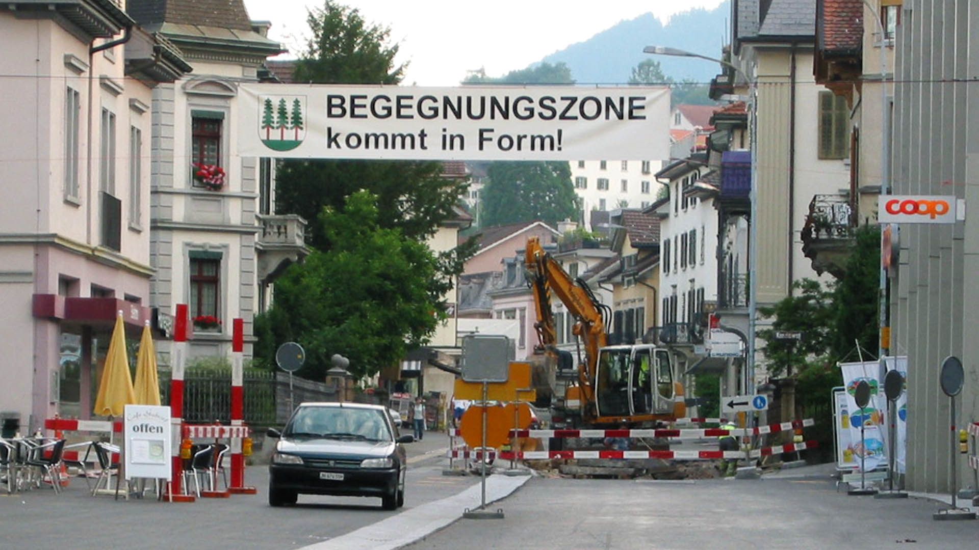 Die Umgestaltung 2005 in eine „Begegnungszone“ war eine wichtige Aufwertung für das Dorfleben: Sie sollte für Fussgänger attraktiv sein und zum Verweilen einladen, ohne den Verkehr ganz auszusperren.